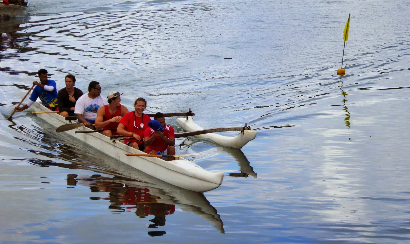 Here is a race committee of one in a traditional canoe. Red flag means to get ready.