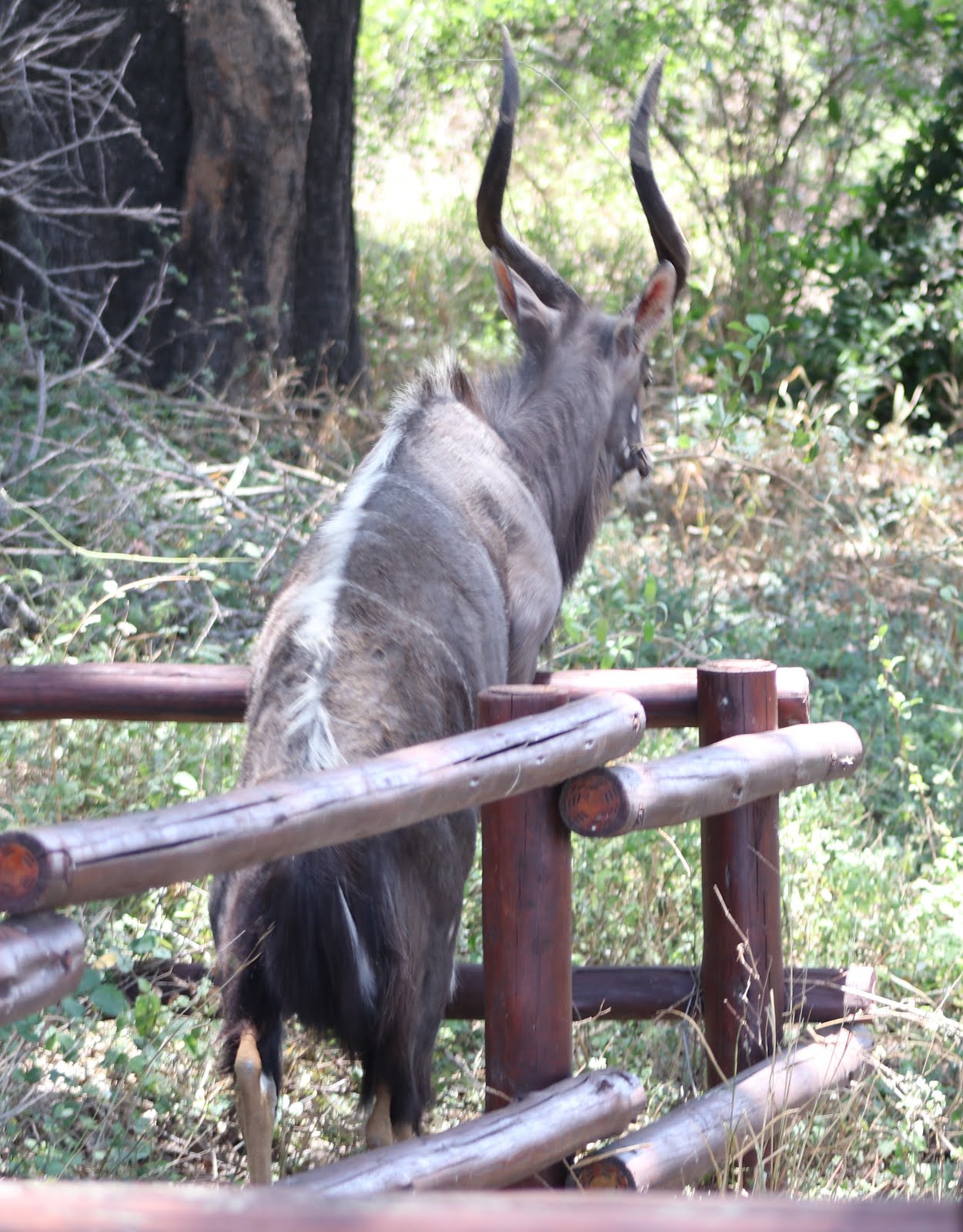 During my trip to Johannesburg I had the opportunity to visit Skukuza, Kruger National Park. It was a wonderful trip, less than a one hour plane trip from Johannesburg. The camp is situated along the Sabie River and there is a lovely walk along the river inside the camp. As I was sitting there enjoying the view - cape buffalo in the river, impalas across the water, a saddle billed stork. a brown snake eagle, a kingfisher and a lapwing and heron fishing, there was a rustle just behind me. I didn't want to look as I really wanted to stay in the peaceful moment and didnot want anyone to disturb it. But the noise just coming closer so I looked up and much to my surprise - there was a beautiful Nyala walking right by me! How did he get into the Camp, well, let me show you.